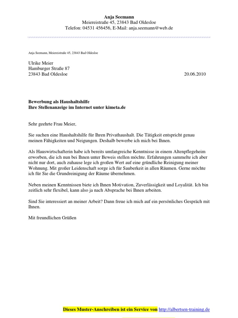 Musterbewerbung: Bewerbung als Haushaltshilfe (Job)
